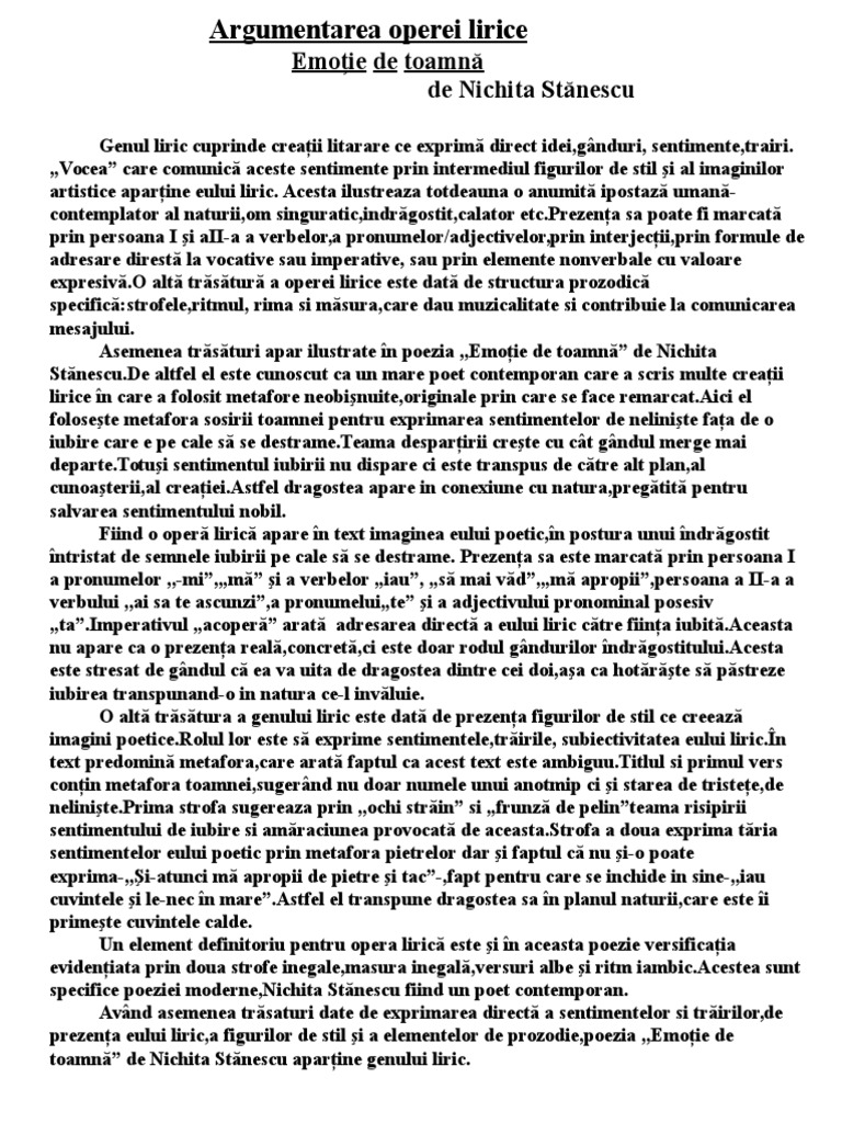 Argumentarea Operei Lirice Emotie De Toamna